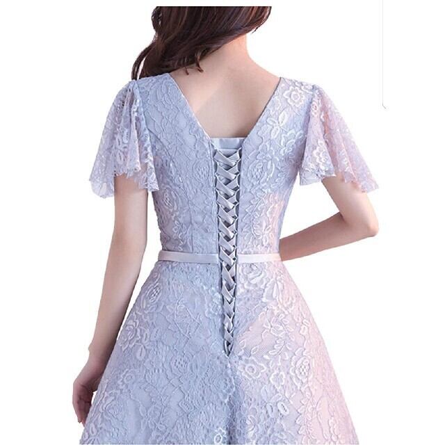 花柄刺繍レースミディアムドレスです。全体に刺繍が施されたレ-スが重ねられとても美しく豪華で大人の女性を醸し出してくれるエレガントなドレスです。デザイン性のあるスタイルがとても魅力的な一着です。全体的に優しい感じに仕上げられています。背中網掛け。胸パット付き。
