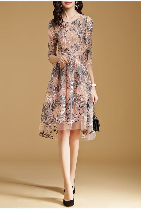 ラベンダー色ボタニカル刺繍の上質ワンピースです。やさしいラベンダーのチュール地にカラフルなボタニカル刺繍をほどこした可愛らしいデザイン。透け感がキュートなセクシー感を演出。優しい感じのワンピ-スです。背中ファスナーあり。裏地あり。