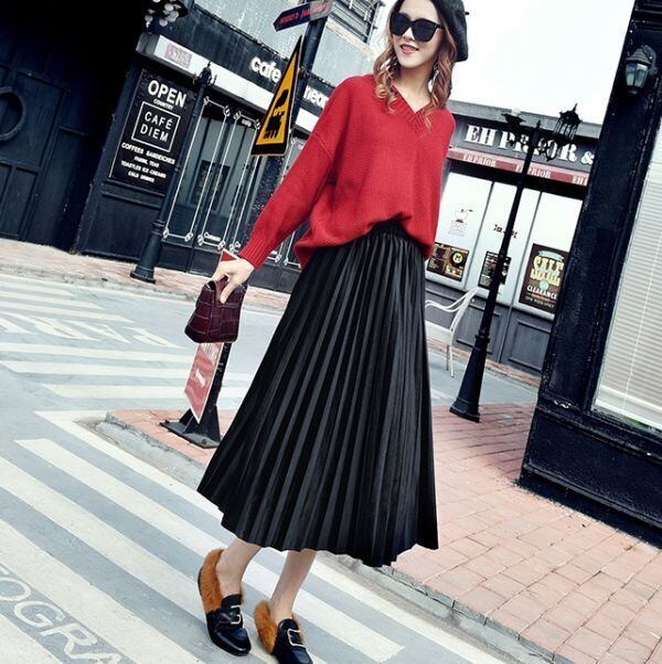 ブラックの光沢プリ-ツミモレ丈スカ-トです。光沢の輝きがとても綺麗でプリ-ツならではでとても女性らしくまるで女優になった気分にさせてくれます。少し後ろが長めの丈になっていて大人のエレガンスさを感じさせてくれるデザインです。ファスナーなし(ウエストゴム仕様)。裏地なし。