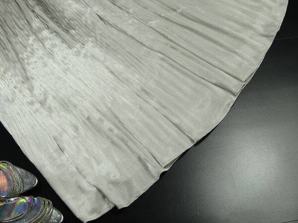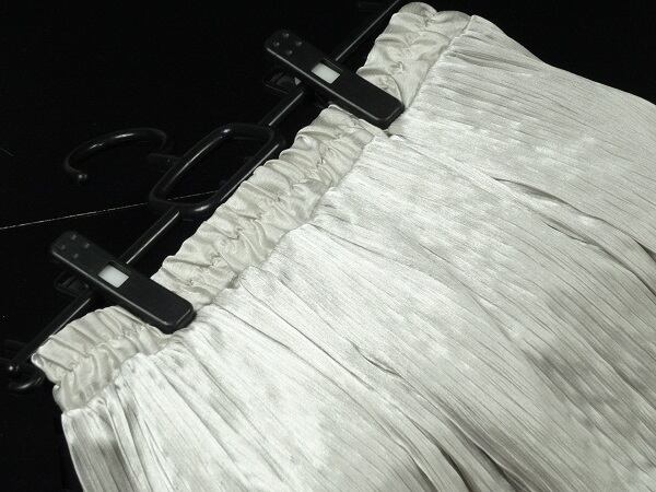 光沢のある薄いゴ-ルドのプリ-ツスカ-トです。プリ-ツ幅は細かくしなやかな柔らかい生地で動くたびに揺れるエレガントなプリ-ツスカ-トです。ファスナ-なし(ウエストゴム仕様)。裏地有。