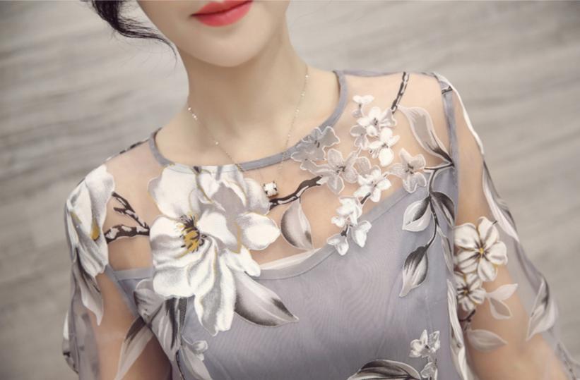 シックなオーガンジーのワンピース。落ち着いたグレーの地にモノトーンの花模様がバランスよくプリントされています。デコルテライン、袖のほんのり肌見せ透け感がエレガントで魅力的な一着です。結婚式や謝恩会などに。背中ファスナー有。裏地あり。