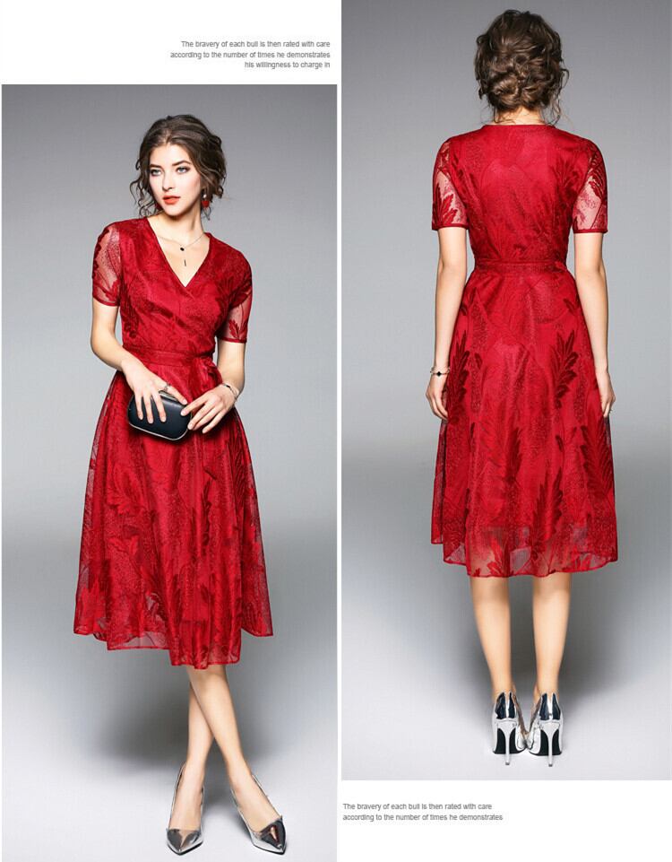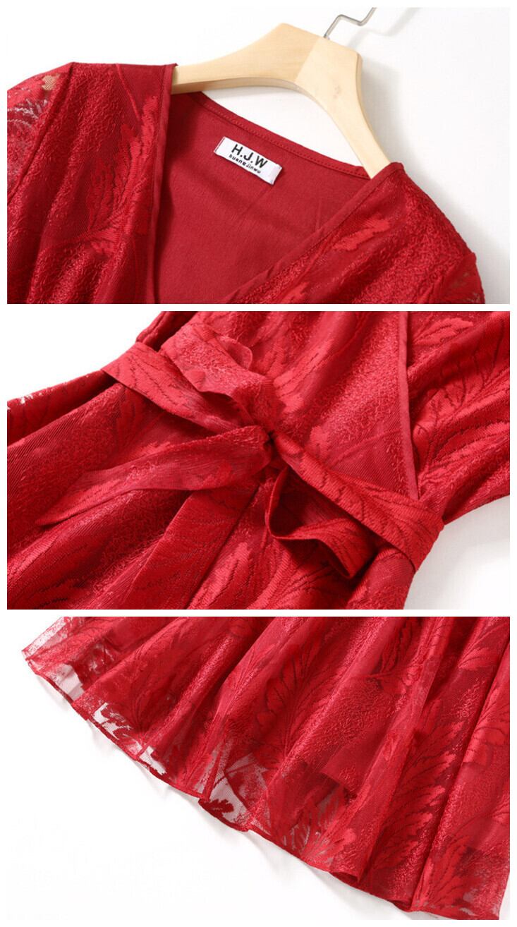 透け感が美しいVネックレース仕様のワンピ-ス。トップス部分はカシュクール風のVネック仕様。ウエストで切り返しが入り、裾までボタニカル柄をあしらったレース仕立ての生地をたっぷりと使用。ボリュームを出し華やかな印象に。袖は透け感があり、二の腕がほんのりと見え、品の良いセクシー感をかもしだしています。ウエストを共布のベルトリボンでキュッと絞るデザイン。シックでやさしくエレガントな一着です。右脇ファスナーあり。裏地付き。