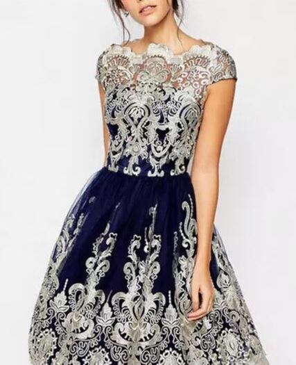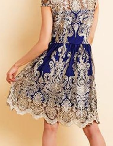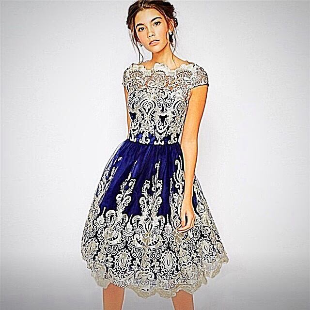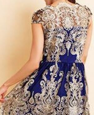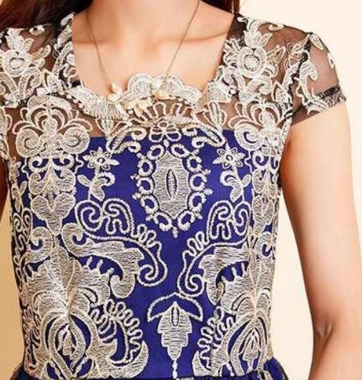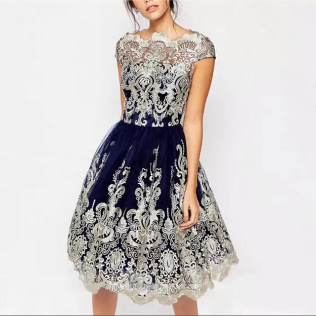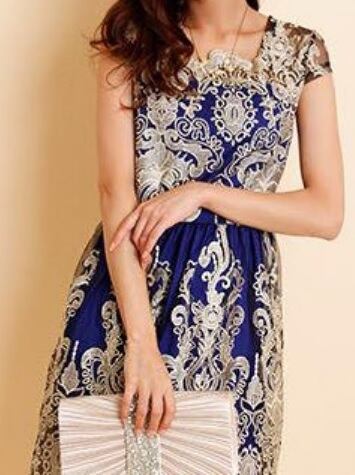 ボタニカル立体刺繍の上質ワンピースです。ブル-のチュ-ル地に金糸のボタニカル立体刺繍をほどこした豪華さが演出されたデザインです。胸元の透け感がとてもエレガントかつセクシ-な一着です。左サイドファスナーあり。裏地あり。
