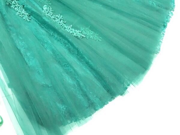 花柄刺繍チュールパ-ティ-ロングドレスです。トップス部分にグリ-ン糸の刺繍が施されたレースが重ねられとても豪華です。背中にはファスナ-と飾りボタンが付いています。胸上から袖にかけての透け感がとてもエレガントかつセクシ-です。