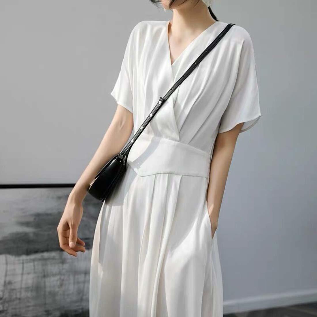 Vネックマキシ丈ワンピ-スです。サラッとした生地でザクッと着るデザインです。Vネックがセクシ-感を演出し、上品でフェミニンな印象のデザインは、様々なシーンで活躍してくれる一着です。ファスナーなし(かぶるタイプ)。裏地あり。