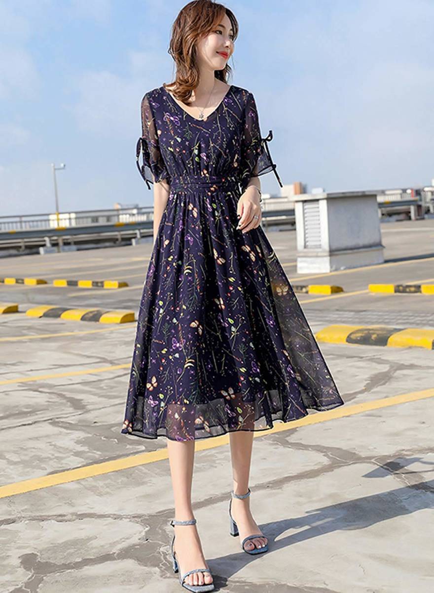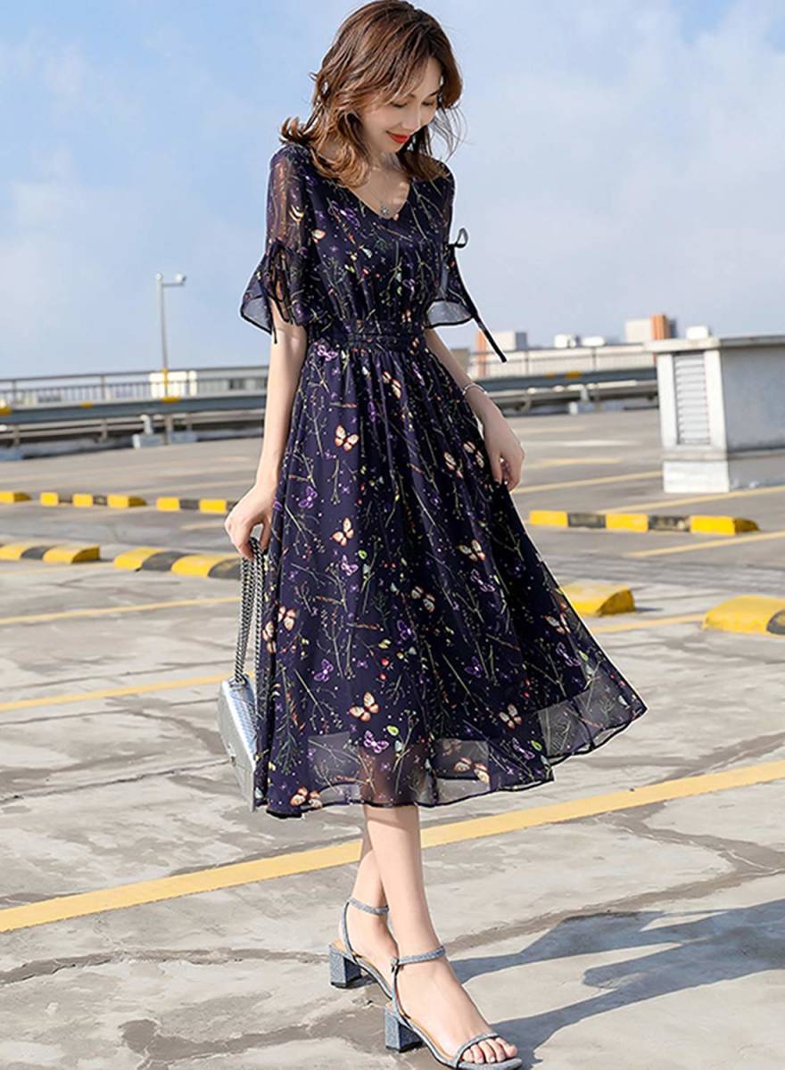ハイウエスト花柄マキシ丈ワンピースです。黒地に落ち着いた色合いの花柄をプリント。透け感のあるしなやかな袖とハイウエストによる足長効果のある軽やかでピュアでフェアリーなデザインになっています。煌めく太陽の光の中でも、また新緑の爽やかな風の中でも、着る人を美しく魅せてくれる一着です。裏地有り。右サイドファスナ-有。