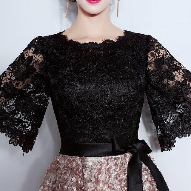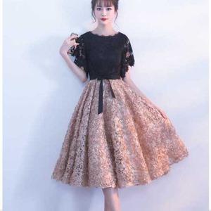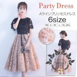 トップスレ-ス仕立ドレスワンピース。トップスは黒のレ-ス仕立て。スカート部分はピンクベージュの花レース風。女性らしさとエレガントさを同時に演出した一品です。胸パット入り。ウエスト黒サテンリボン付き。背中ファスナー。裏地付。