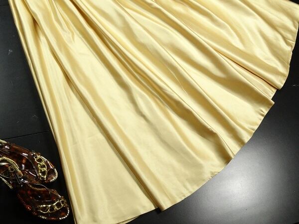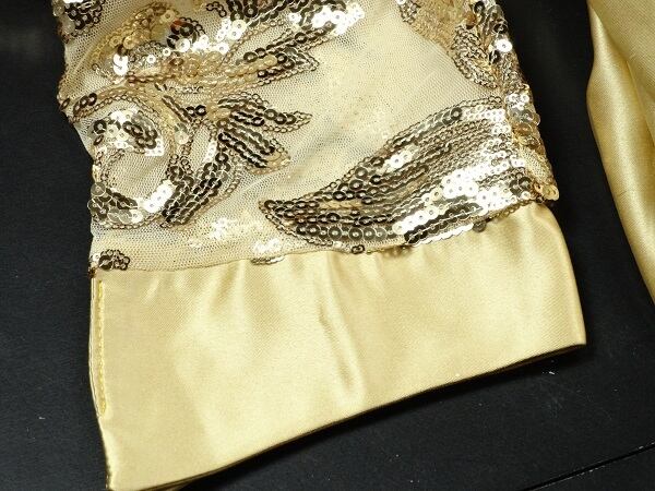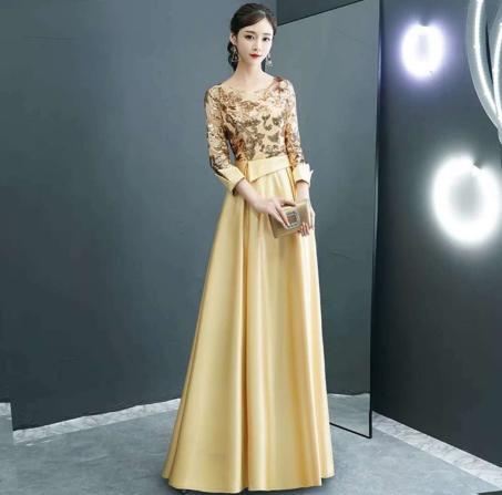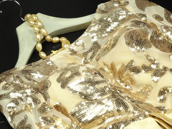 ゴールドスパンコ-ルイブニングロングドレスです。気品に満ちたとてもエレガントで上品なひとクラス上をいく一品です。トップス部分のレースの透け感とゴールドのビジュ-飾りが輝きを放ち豪華かつ上品でエレガントなドレスです。背中ファスナ-有。胸カップ付き。裏地有。