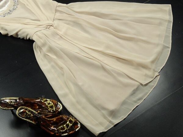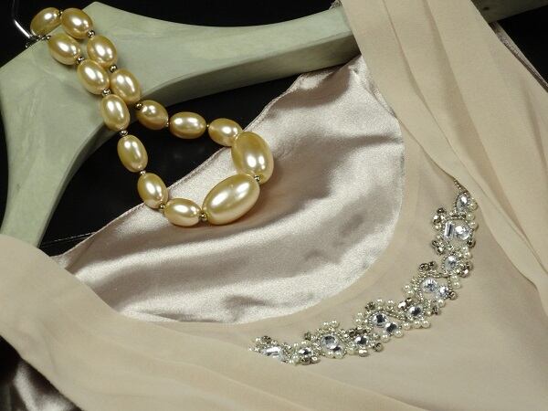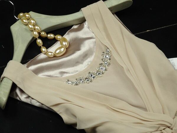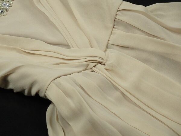 胸元飾りとドレープが優雅なワンピ-スです。胸元の飾りが素敵で胸元両サイドから腰にかけてのドレ-プが女神のような高貴なイメージを与えています。結婚式、パーティ、イベント、コンサートなどどんなフォーマルなシーンでもひときわ輝きを放つことでしょう。ファスナーなし(かぶるタイプ)。裏地付。