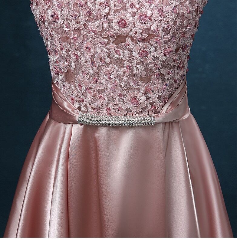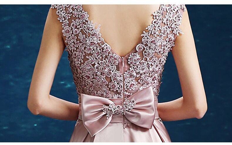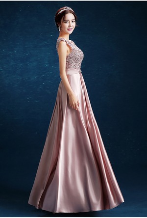 レース切替バックリボンサテンロングドレスです。気品に満ちたとてもエレガントで上品なひとクラス上をいく一品です。トップス部分は花刺繍が施されたレースがサテン地に重ねられ豪華かつ上品でエレガントなドレスです。背中ファスナ-有。胸カップ付き。裏地有。