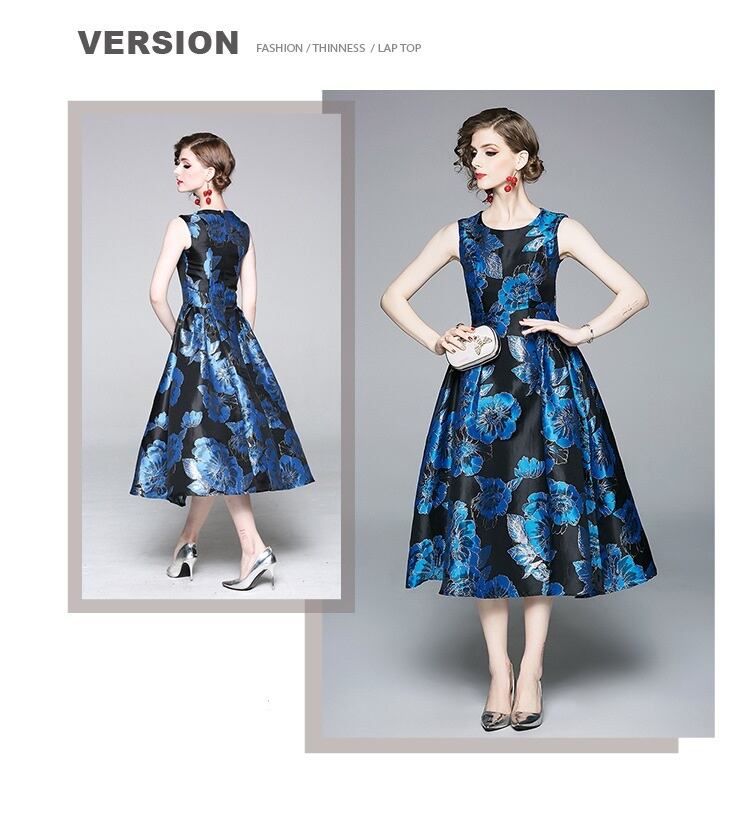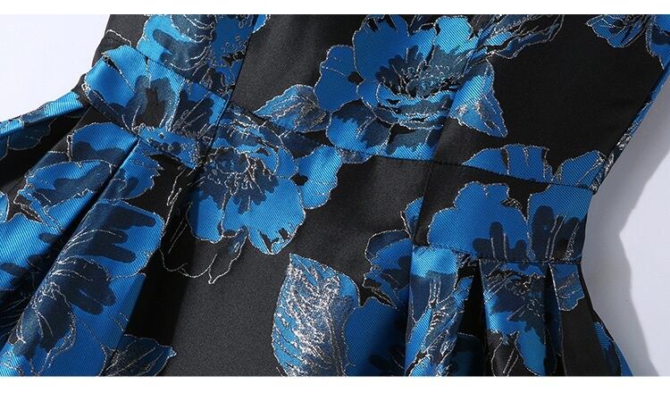 花柄ジャガ-ド織ミディアムドレスです。ジャガ-ド織立体花柄刺繍がとても上品かつ豪華で飽きのこない着まわせる一着です。ブル-とブラックとシルバ-のコントラストがとても綺麗で大人の女性度をUPしてくれてます。裏地有。背中ファスナ-有。
