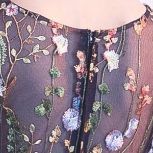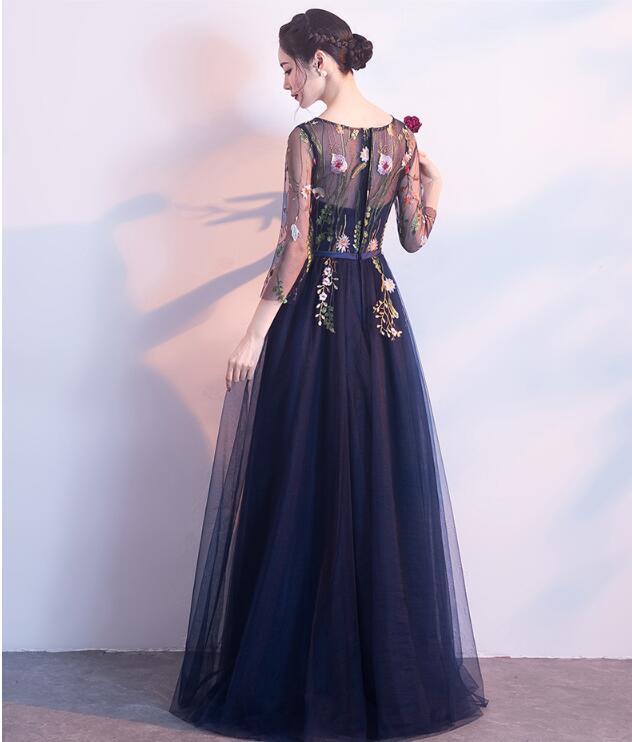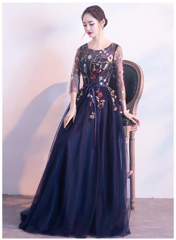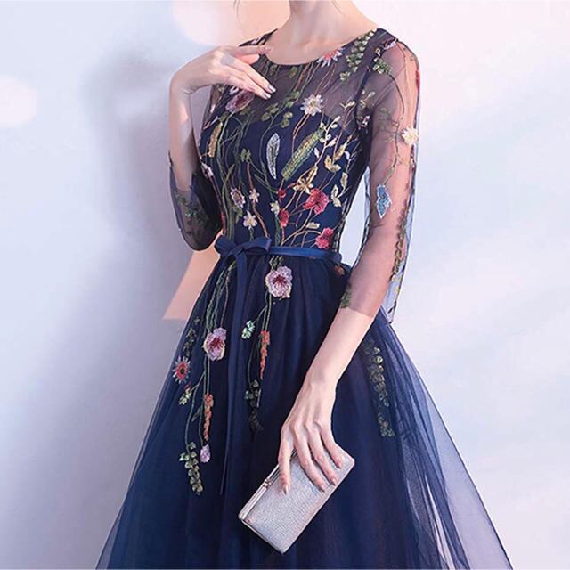 花刺繍ロングチュ-ルパ-ティ-ドレスです。深いネイビ-のサテン地の上に、ネイビ-の花刺繍をほどこしたチュ-ルが重ねられた豪華でフェミニンなデザイン。デコルテラインから肩にかけての透け感が大人の雰囲気を醸し出し、シックで上品な女性を表現。パーティやイベント、コンサート、結婚式にと、さまざまシーンで活躍してくれる美しい一着。背中ファスナー有。胸パット付。