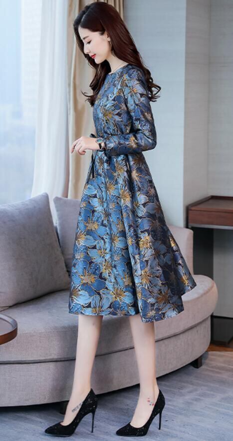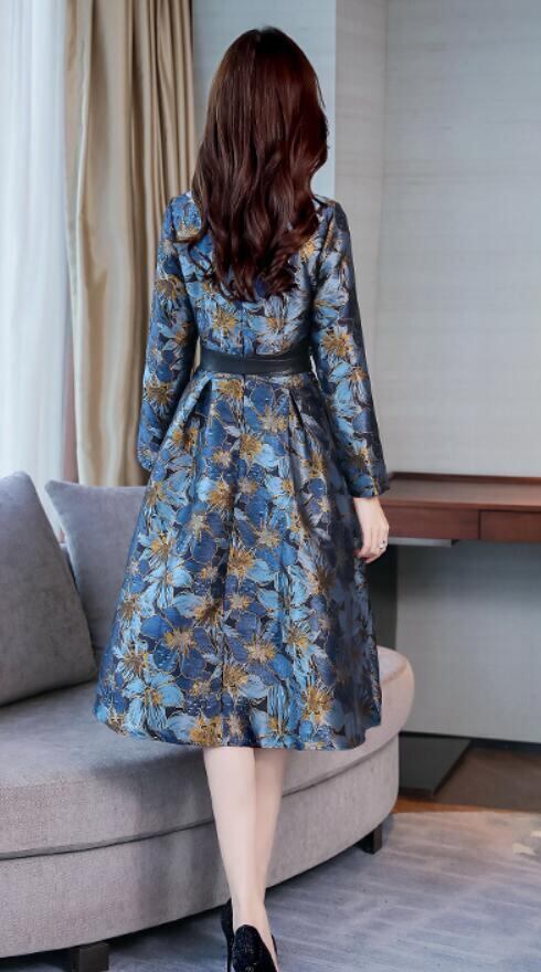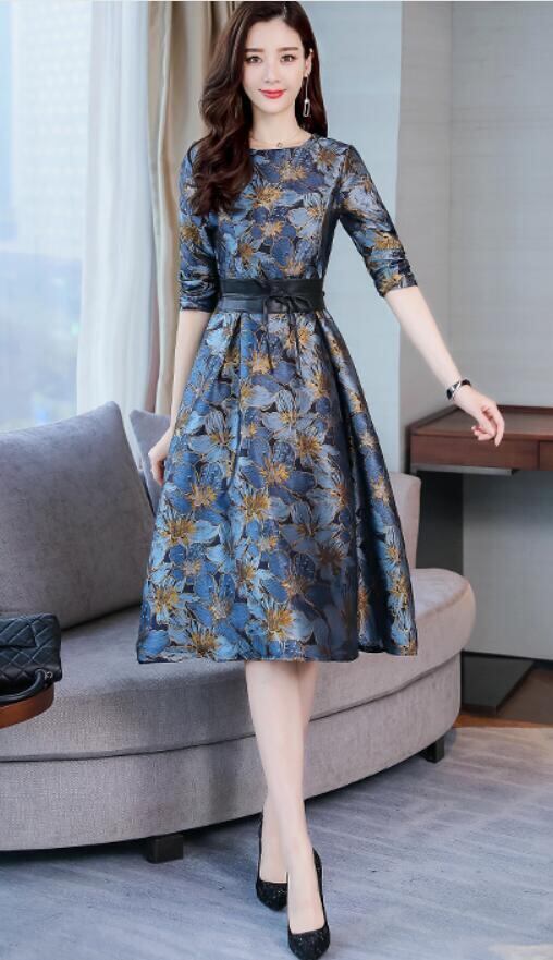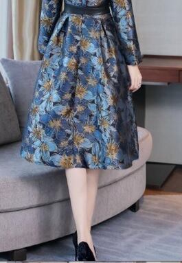 花柄ジャガ-ド織ミディアムワンピ-スです。ジャガ-ド織立体花柄刺繍がとても上品かつ豪華で飽きのこない着まわせる一着です。紺系と金糸のコントラストがとても綺麗で大人の女性度をUPしてくれてます。裏地有。背中ファスナ-有。ベルト付き(取り外し可)。