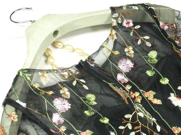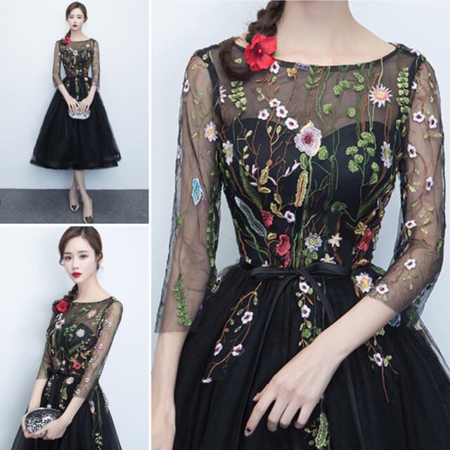 花刺繍ミモレ丈チュ-ルパ-ティ-ドレスです。黒のサテン地の上に、黒の花刺繍をほどこしたチュ-ルが重ねられた豪華でフェミニンなデザイン。デコルテラインから肩にかけての透け感が大人の雰囲気を醸し出し、シックで上品な女性を表現。パーティやイベント、コンサート、結婚式にと、さまざまシーンで活躍してくれる美しい一着。背中ファスナー有。胸パット付。