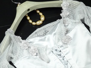 オフショルダーのフィッシュテールドレス。オフショルダーの袖から胸にかけて、繊細なレースに花のモチーフをあしらい、袖は途中でゴムできゅっとしぼり、袖先がチューリップの花の様に広がって華やかだ可愛い印象に。レース部分は透け感があり、デコルテラインを美しくみせてとてもエレガント。パーティやイベント、結婚式など、様々なシーンで、気品のある印象を与えてくれる一枚です。裏地あり。背中結び紐有。背中腰から下ファスナ-有。胸パット付き。ベルト飾り付き。