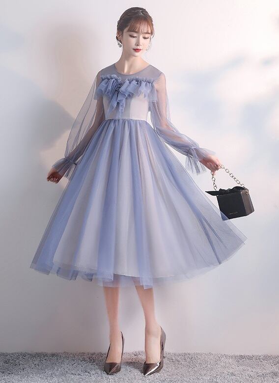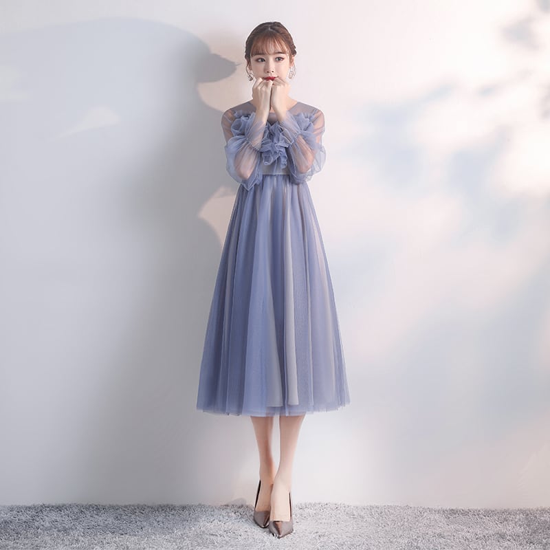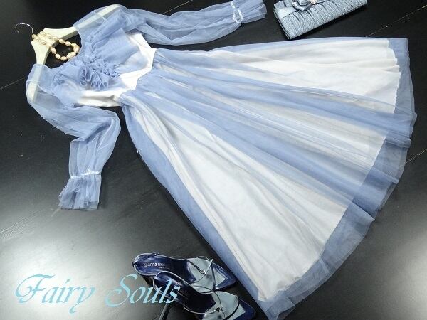 チュールフリル飾りのパーティードレス。白の下地にさわやかな水色のチュールを2枚重ね、胸元と背中部分はチュールのフリルをまとめて立体的に。袖口はきゅっとしぼりふんわり感を演出。下地の白が透けて見え、全体的にキュートでさわやかな雰囲気に。サイズは7号ですが、ウエストは9号サイズ位ありゆったりしています。パーティやイベント、結婚式など、様々なシーンで、気品のある印象を与えてくれる一枚です。裏地なし。背中ファスナ-有。胸パット付。