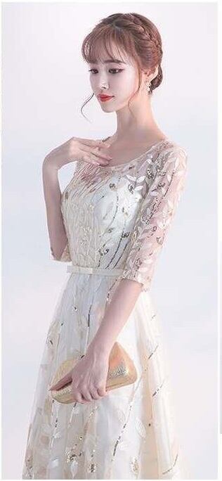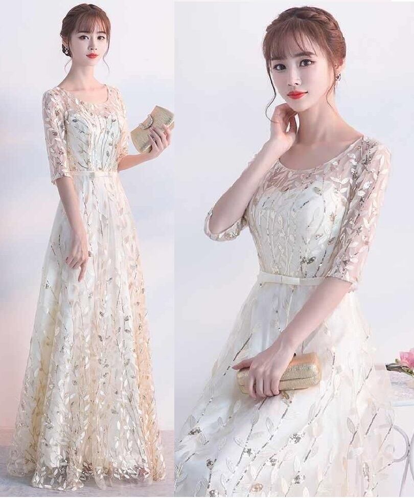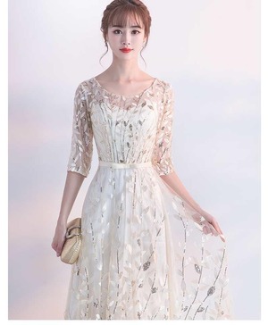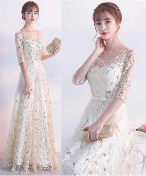 刺繍レースパーティ-ロングドレスです。袖やデコルテの透け感がとても美しく大人の女性を醸し出してくれるエレガントなロングドレスです。全体にゴールドの刺繍とビジュ-飾りが施されデザイン性のあるスタイルがとても魅力的な一着です。全体的に優しい感じに仕上げられています。背中ファスナ-有。胸パット付き。