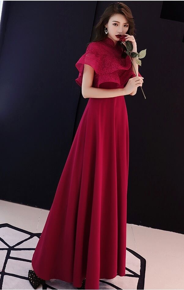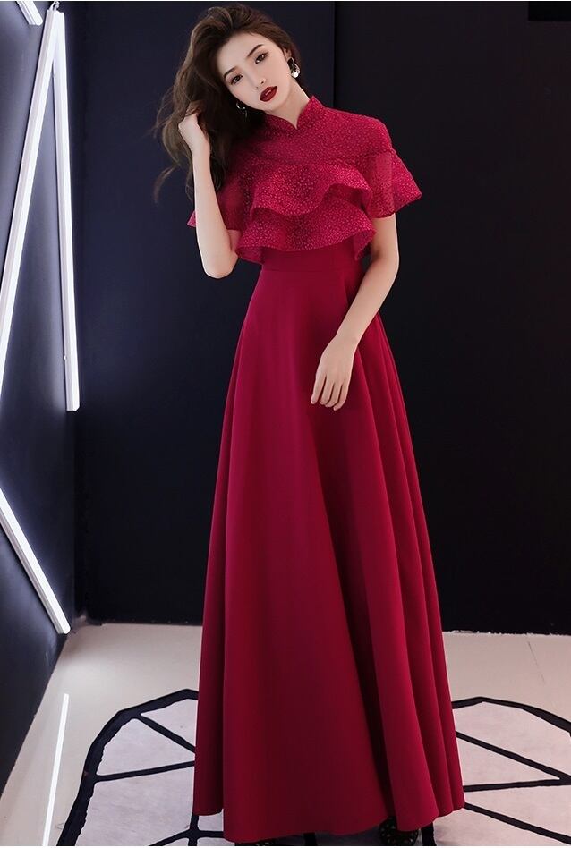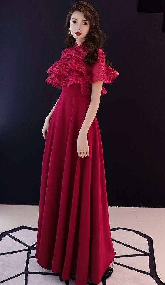 胸元レース重ねのロングドレス。襟は立て襟で、胸元から袖にかけて繊細なレースを重ねたれ大人の女性の魅力を引き出してくれる一着です。本体部分は伸縮性のあるジャージ素材。目に鮮やかな赤の生地をたっぷりと使用しボリューム感を出しています。パーティやライブ、イベント、結婚式など、どんなシーンでも活躍してくれる一着です。裏地なし。背中ファスナー有。