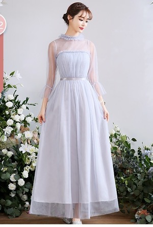 チュール重ねパーティーロングドレスです。サテン地にグレ-のチュールが2枚重ねられ。袖口はきゅっとしぼりふんわり感を演出。同色の下地の白が透けて見え、全体的にキュートでさわやかな雰囲気に背中はシャ-リングになっていて多少伸縮性があります。パーティやイベント、結婚式など、様々なシーンで、気品のある印象を与えてくれる一枚です。裏地なし。右サイドファスナ-有。
