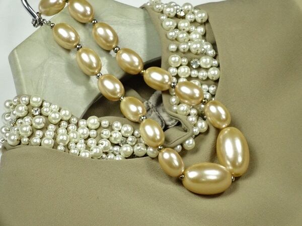 ノースリ-ブワンピ-スです。首回りのパ-ル飾りがとても豪華です。背中ファスナー有。裏地有。