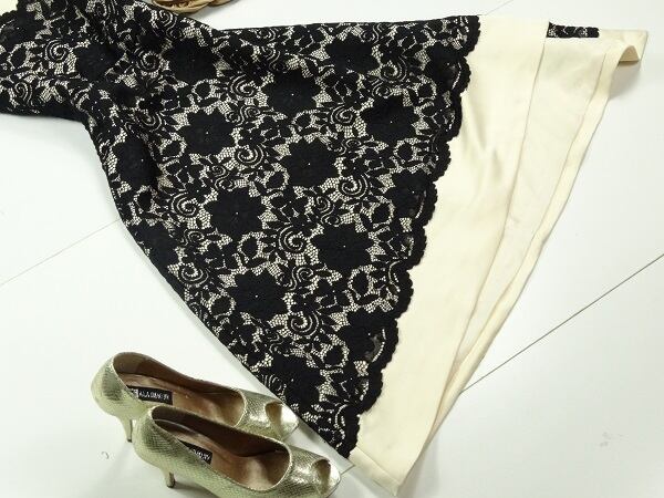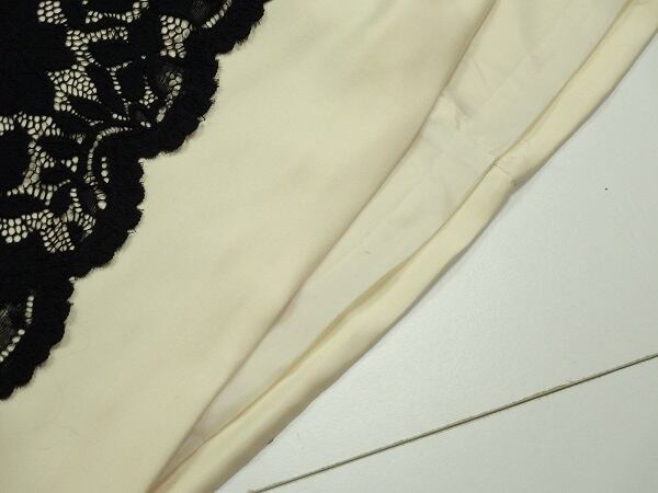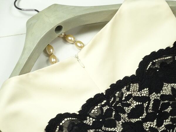 ノースリ-ブレース重ねワンピ-スです。しっかりとしたサテン生地に黒のレ-スが重ねられ裾の長さの異なるデザインです。左サイド裾部分は約35cmのスリットになっています。背中ファスナー有。裏地有。