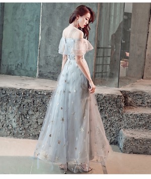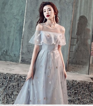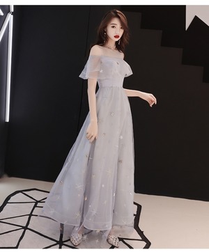 胸元フリルのチュールパーティ-ロングドレスです。胸元はフリルになっていて肩の透け感がとてもシックです。全体にネットチュールの上に繊細な花の刺繍をあしらい華やかなデザインになっています。パーティやイベント、結婚式など、様々なシーンで、気品のある印象を与えてくれる一枚です。背中ファスナ-有。