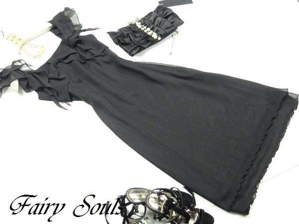 パ-ティ-膝丈ワンピ-スです。スカ-トは、ゆるやかな流れるようなAラインで肩のフリルが存在感を増しています。裏地有り。左サイドファスナ-有。
