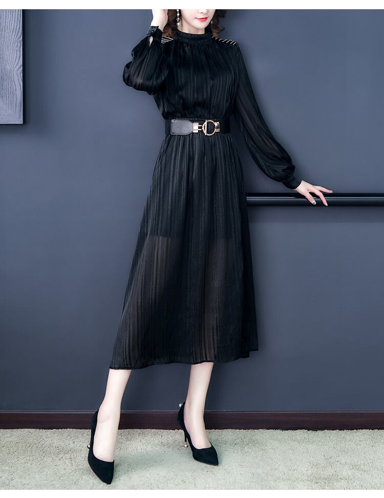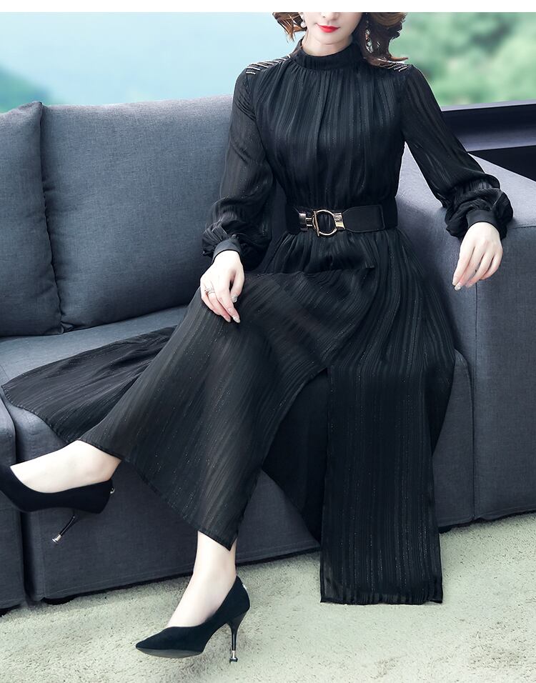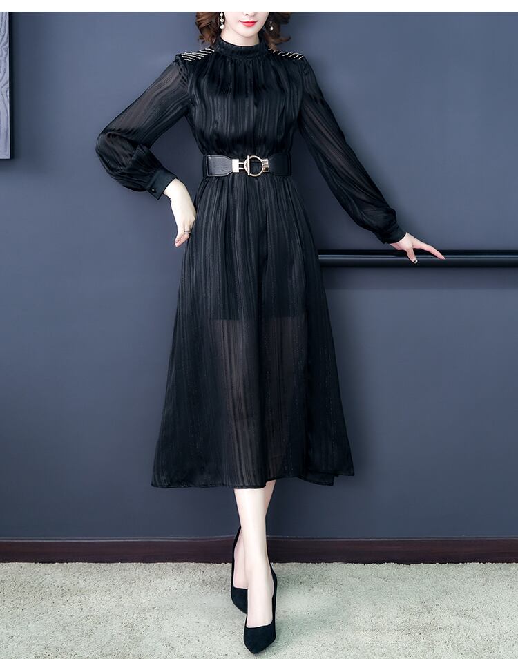 透け感が美しいレイアードワンピ-スです。黒の生地に金ラメが散りばめられ左サイド裾に約37cmのスリットが有りとてもエレガントなワンピ-スです。透け感があり、品の良いセクシー感をかもしだしています。シックでやさしくエレガントな一着です。ファスナーなし(かぶるタイプです)。首後ろボタン1つ有。裏地付き。ベルト付き。