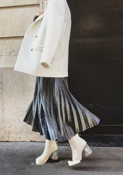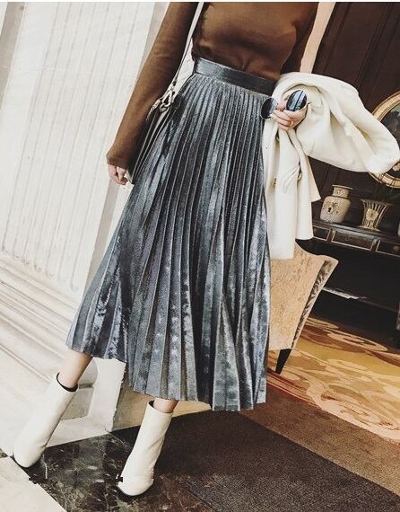 メタリックグレーの光沢プリ-ツロングスカ-トです。光沢の輝きがとても綺麗で歩くたびの揺れ感がプリ-ツならではでとても女性らしくまるで女優になった気分にさせてくれます。大人のエレガンスさを感じさせてくれるデザインです。ファスナー有。裏地あり。