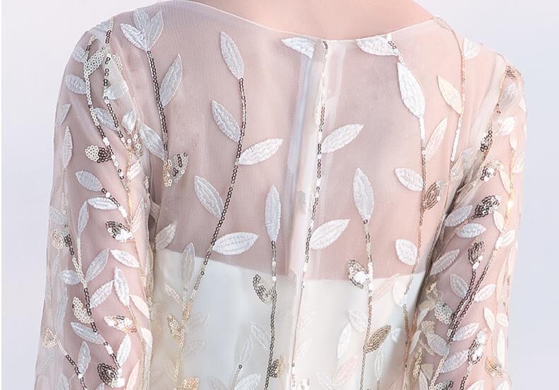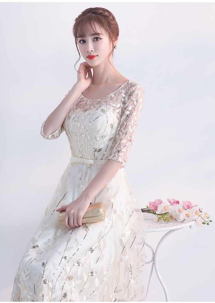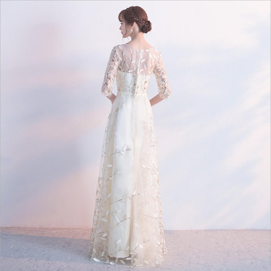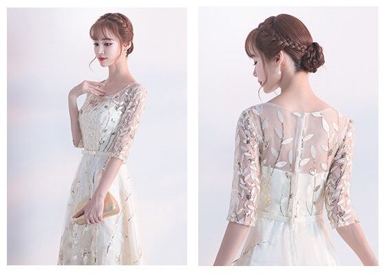 刺繍レースパーティ-ロングドレスです。袖やデコルテの透け感がとても美しく大人の女性を醸し出してくれるエレガントなロングドレスです。全体にゴールドの刺繍とビジュ-飾りが施されデザイン性のあるスタイルがとても魅力的な一着です。全体的に優しい感じに仕上げられています。背中ファスナ-有。胸パット付き。