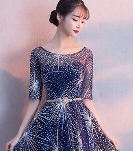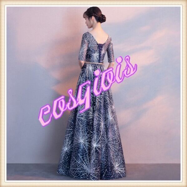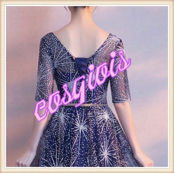 スパンコール仕様パーティ-ドレス。深いネイビーのチュール地に小さなスパンコールを全体にあしらった豪華な印象のデザイン。背中はウエストから上がリボンの編み上げになっており、腰から下はファスナーが付いています。ゴールドカラーのチェーンベルト付き。胸パット付き。