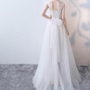 サテン地にチュール重ねのウエディングロングドレスです。たっぷりとした薄いゴ-ルドのサテン地にやわらかなチュールを重ねたデザイン性のあるスタイルがとても魅力的です。後ろの着丈が長いデザインで、胸元の立体刺繍が豪華かつ上品で全体的に優しい感じに仕上げています。結婚式、パーティ、コンサートにと、華やかなシーンに最適な一着です。背中ファスナ-有。胸パット付き。ベール・チュ-ルリボン・ネックレス・イヤリング付。