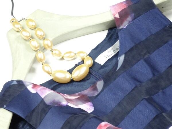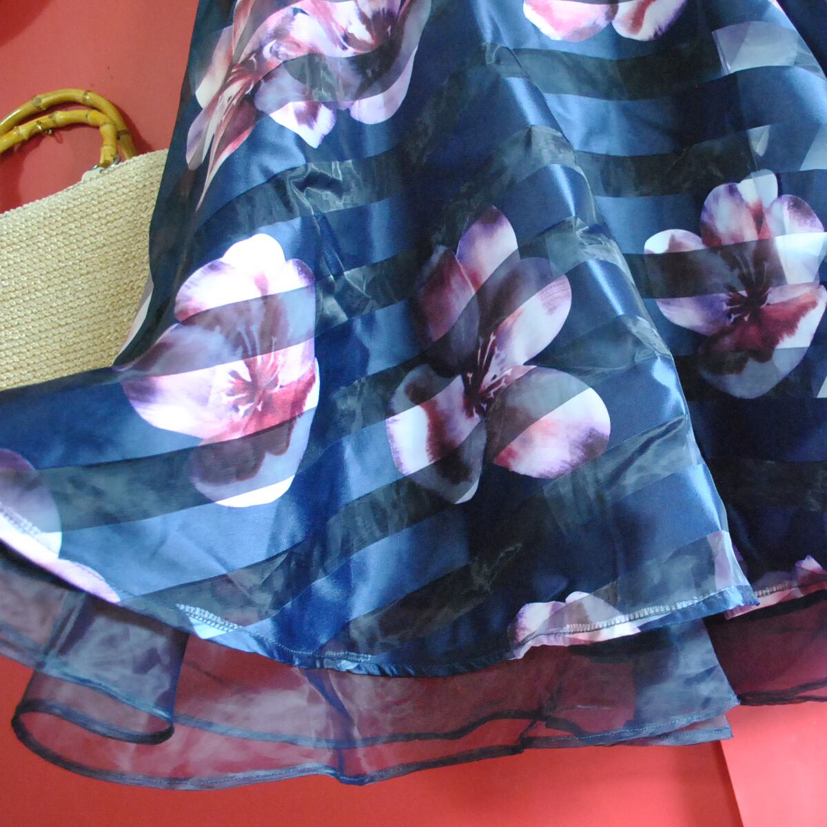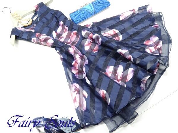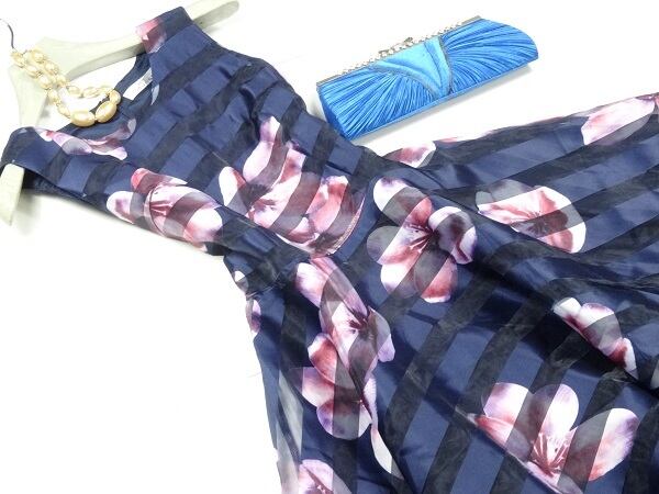 ノースリ-ブフレア-花プリント膝丈ワンピ-スです。大人っぽい色合いで結婚式やパ-ティ-にもお薦めの一着です。背中ファスナー有。裏地有。