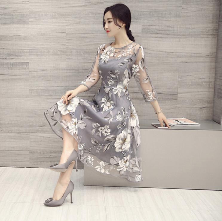 シックなオーガンジーのワンピース。落ち着いたグレーの地にモノトーンの花模様がバランスよくプリントされています。デコルテライン、袖のほんのり肌見せ透け感がエレガントで魅力的な一着です。結婚式や謝恩会などに。背中ファスナー有。裏地あり。