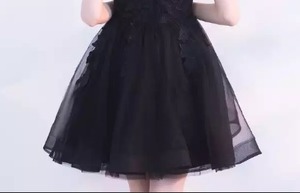 トップス部分立体花柄刺繍チュールパ-ティ-ミニドレスです。トップスに黒糸の立体刺繍が施されていてとても豪華です。全体的にサテン地の上に無地のチュールを2重たっぷりと重ね豪華な雰囲気に。パーティやイベント、結婚式など、様々なシーンで、気品のある印象を与えてくれる一枚です。背中ファスナ-有。胸パット付。