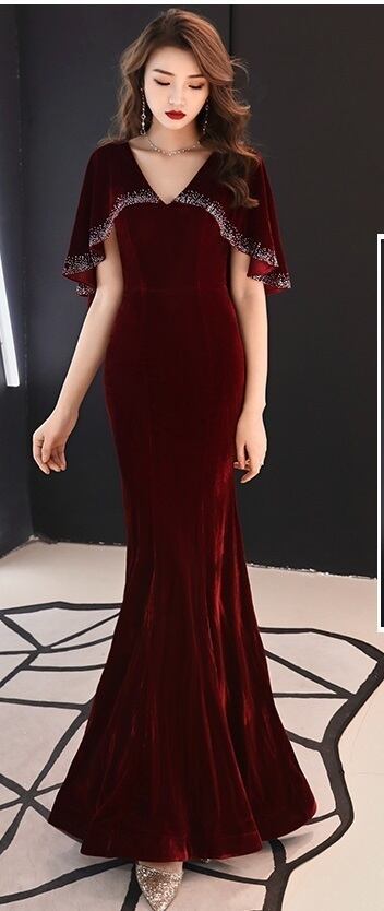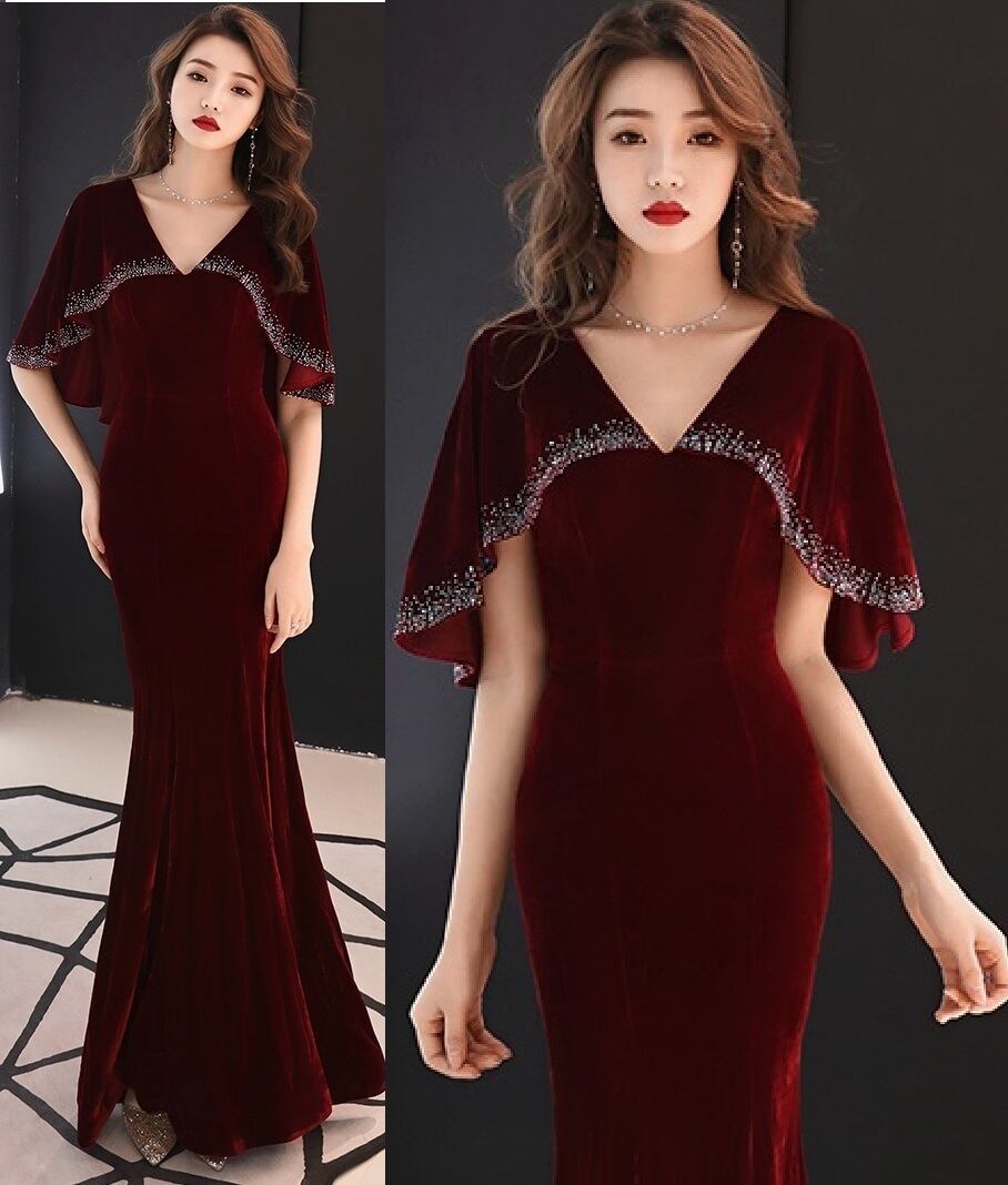 胸元ビジュ-飾りマーメイドロングドレスです。全体的に伸縮性のある素材で目に鮮やかなワインレッドの生地を使用しスリム感を出しています。パーティやライブ、イベント、結婚式など、どんなシーンでも活躍してくれる一着です。裏地なし。背中ファスナー有。