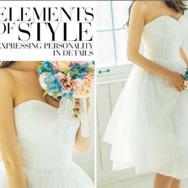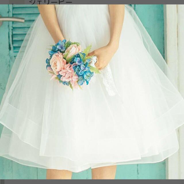 膝丈ウエディングドレスです。スカ-ト部分はサテン地にチュ-ルが重ねられとてもエレガント。パーティやイベント、結婚式など、様々なシーンで、気品のある印象を与えてくれる一枚です。背中結び紐有。背中腰から下ファスナ-有。胸パット付き。