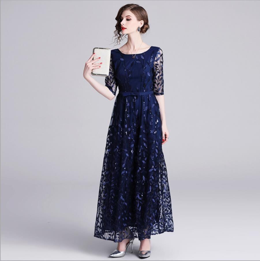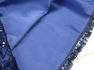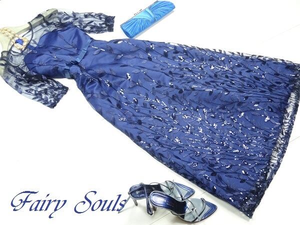 刺繍レースパーティ-ロングドレスです。袖やデコルテの透け感がとても美しく大人の女性を醸し出してくれるエレガントなミディアムドレスです。全体にネイビ-の刺繍が施されデザイン性のあるスタイルがとても魅力的な一着です。全体的に優しい感じに仕上げられています。背中ファスナ-有。裏地有。