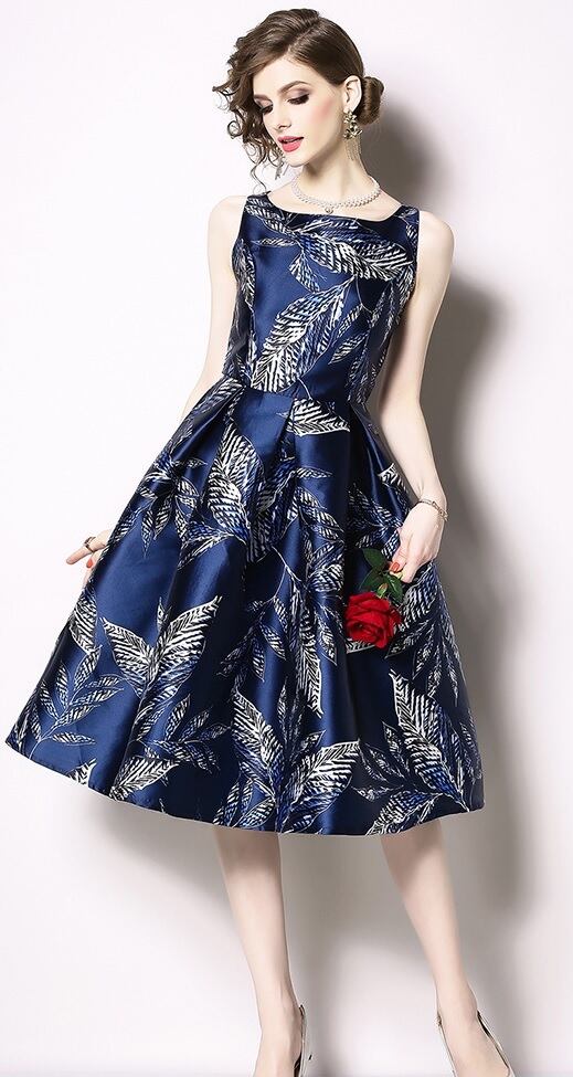 ジャガ-ド織ミディアムドレスです。ジャガ-ド織のプリントがとても上品かつ豪華で飽きのこない着まわせる一着です。紺の濃淡と白のコントラストがとても綺麗で大人の女性度をUPしてくれてます。裏地有。背中ファスナ-有。