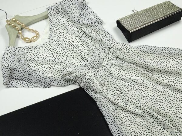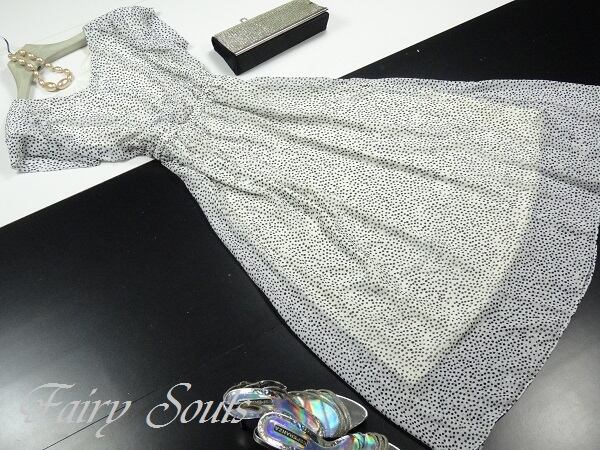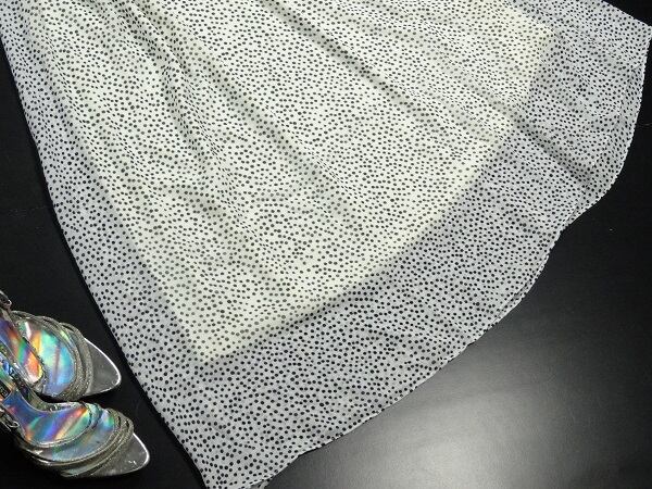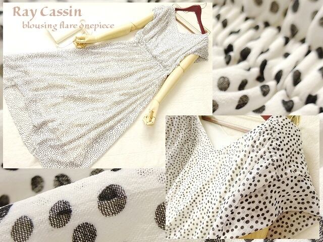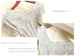 ドット柄シフォンフレア-ワンピ-スです。ウエスト部分はゴム仕様で楽に着用して頂けます。裏地付。ファスナ-なし(かぶるタイプ)。