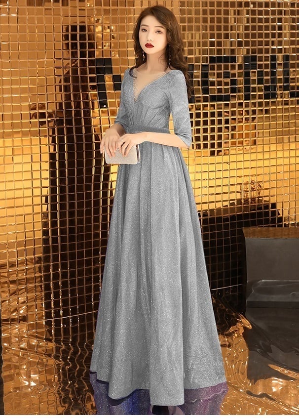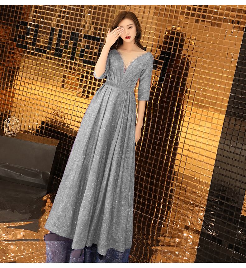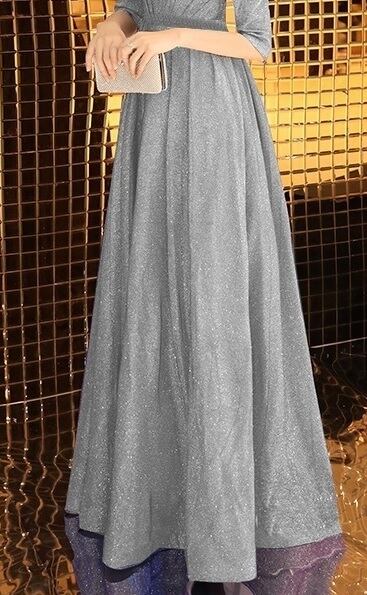 全体にシルバ-ラメが散りばめられたロングドレスです。光の当たり具合で輝く光沢が高級感を醸しだしてくれてます。パーティやライブ、イベント、結婚式など、どんなシーンでも活躍してくれる一着です。背中ファスナー有。裏地有。