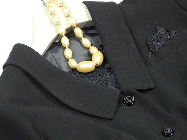 ブラックフォーマルジャケットとスカートのセットです。とてもエレガントです。ジャケットは背中ファスナ-タイプです。スカートは、スリット29cmで後ろファスナー有。裏地有り。