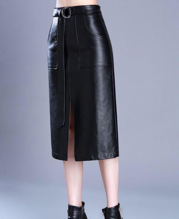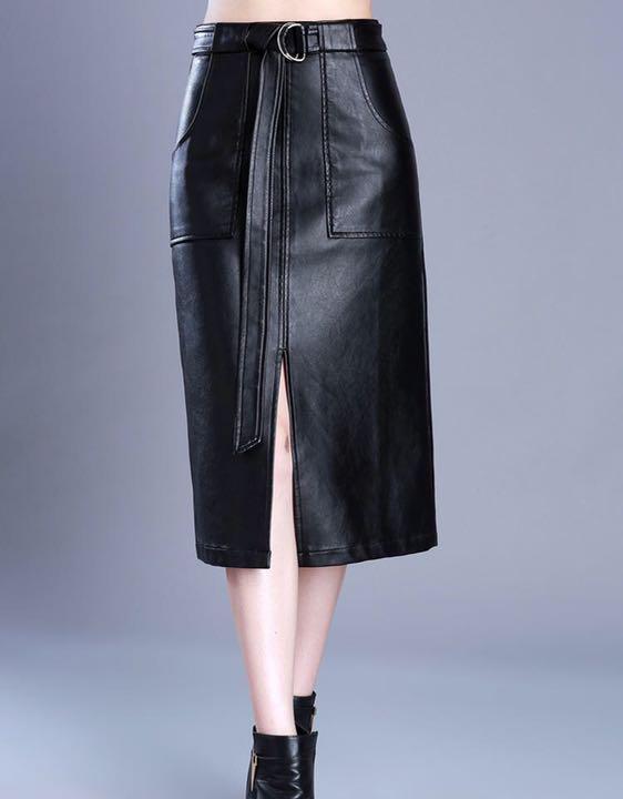 シンプルデザインフェイクレザータイトスカートです。大人の女性を感じさせてくれるタイトのデザインが女性らしくフォ-マルやカジュアルまたパ-ティ-などにもお勧めです。前に2つポケット有。スリット約28cm有り。ベルト付き。後ろファスナー有。裏地あり。