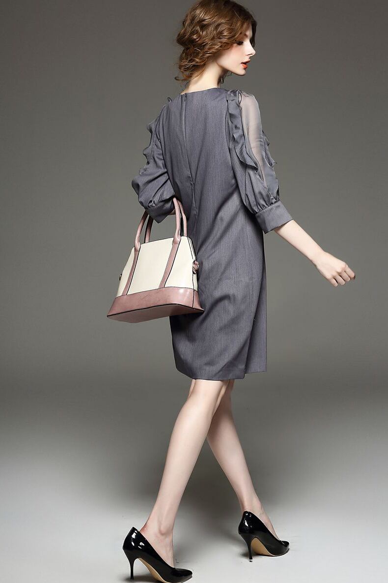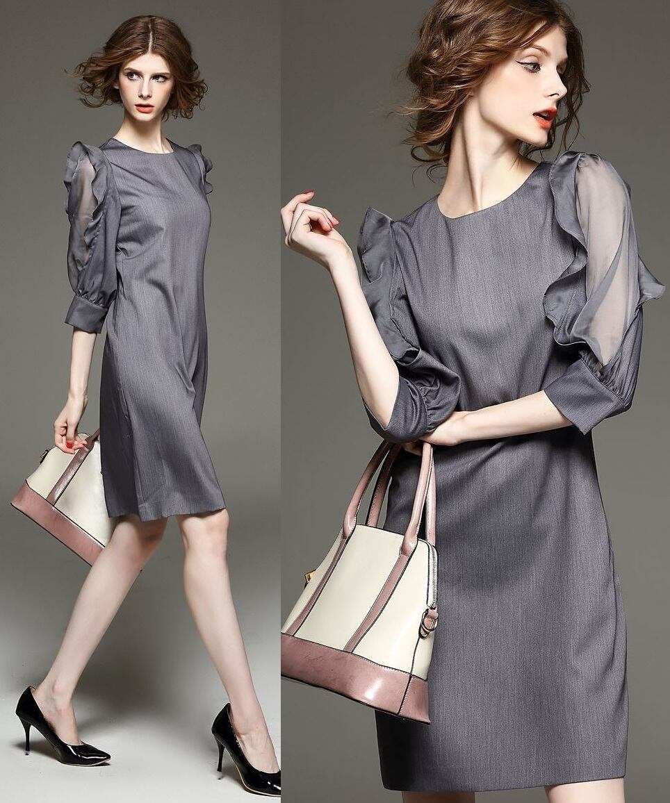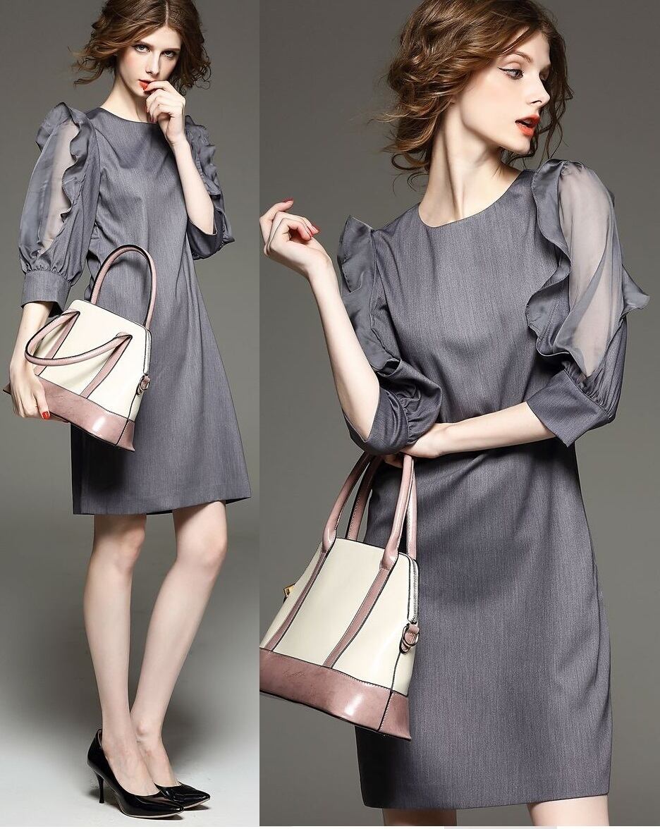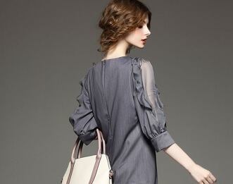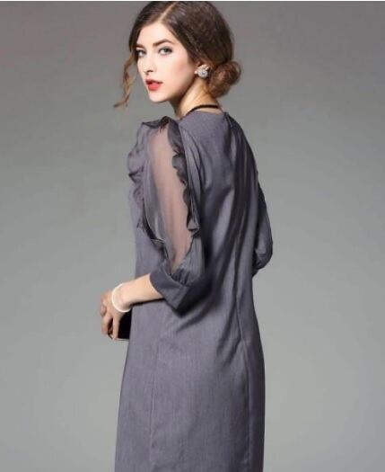 シックなシースル-フォ-マルワンピースです。落ち着いたグレーで腕部分がシ-スル-になっているエレガントなデザインです。結婚式や謝恩会などに。背中ファスナー有。裏地なし。