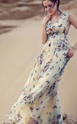 優雅に舞うマキシ丈のワンピース。落ち着いたクリーム地に鮮やかなライトブルーを基調としたレトロポップな絵柄がっプリントされ、たっぷりととられたしなやかな生地が優雅で美しいフォルムを形作っています。上品な一着。裏地付。