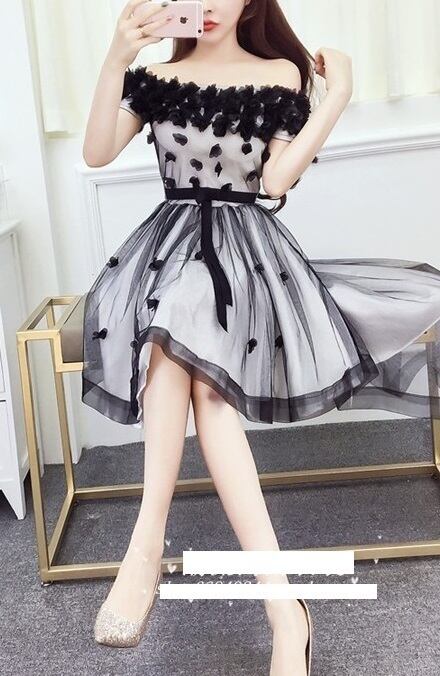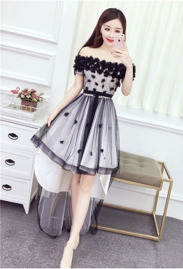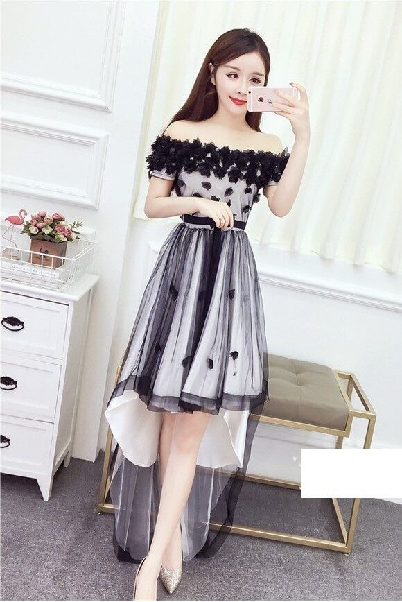 チュールフィッシュテ-ルマキシ丈ドレスです。シルバ-の光沢サテン地の上に黒のチュ-ルが重ねられたとてもエレガントなワンピ-スです。前と後の丈が異なるフィッシュテ-ルです。背中ファスナ-なし(かぶるタイプ)。