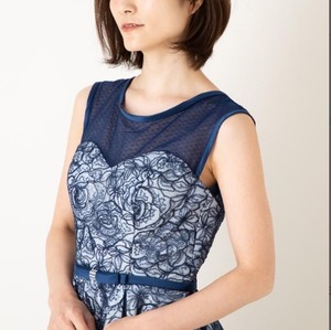 チュールレースのミディアムドレス。白のサテンの下地の上に、紺の刺繍をほどこしたネットチュールが重ねられ豪華でフェミニンなデザインです。デコルテラインから肩にかけての透け感が大人の雰囲気を醸し出し、シックで上品な女性を表現。パーティやイベント、コンサート、結婚式にと、さまざまシーンで活躍してくれる美しい一着。背中網掛け。背中腰より下ファスナー有。裏地付。胸パット付き。