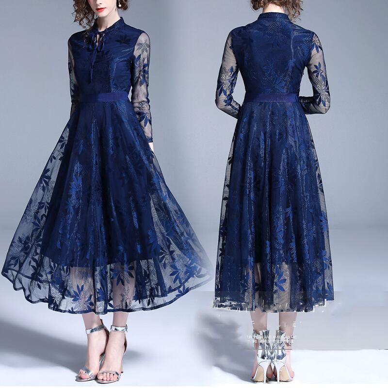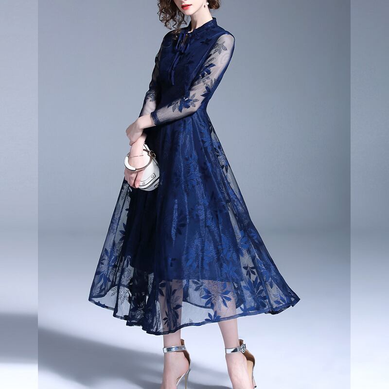 透け感が美しいレース仕様のマキシ丈ワンピ-スです。ウエストで切り返しが入り、裾までボタニカル柄をあしらったレース仕立ての生地をたっぷりと使用。ボリュームを出し華やかな印象に。透け感があり、品の良いセクシー感をかもしだしています。シックでやさしくエレガントな一着です。右脇ファスナーあり。裏地付き。