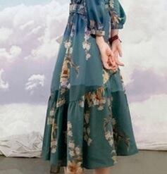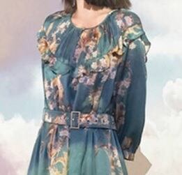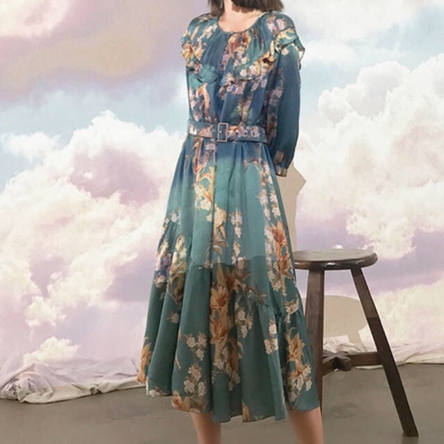 花柄フリルのワンピース。落ち着いたグリーン地にシックな色合いの花模様がプリントされたエレガントで魅力的な一着。首回りは絞ることで細いタックをとり、胸元で切り返しをいれてフリルをあしらっています。ヒップから下にもう一段切り返しを入れることでシンプルなフレアになりがちなラインにユニークなアクセントをプラスしています。ちょっとおしゃれな普段使いからフォーマルなシーンにも。「S」サイズですがゆったりしています。首の後ろ側にくるみボタン一つ留め。ファスナーなし。裏地有。ベルト付き。