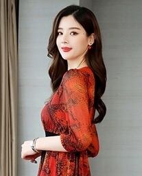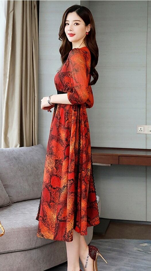 情熱的なV字前クルミボタンのワンピ-ス。ウエストで細かいシャーリングを入れた黒の切り返しが入り、全体に蛇柄がプリントされた印象的なデザイン。生地をたっぷりと使用。ボリュームを出し華やかな印象に。品の良いセクシー感をかもしだしています。情熱的で魅力的なな一着です。ファスナーなしのかぶるタイプ。前身ごろ飾りクルミボタン付き。裏地なし。